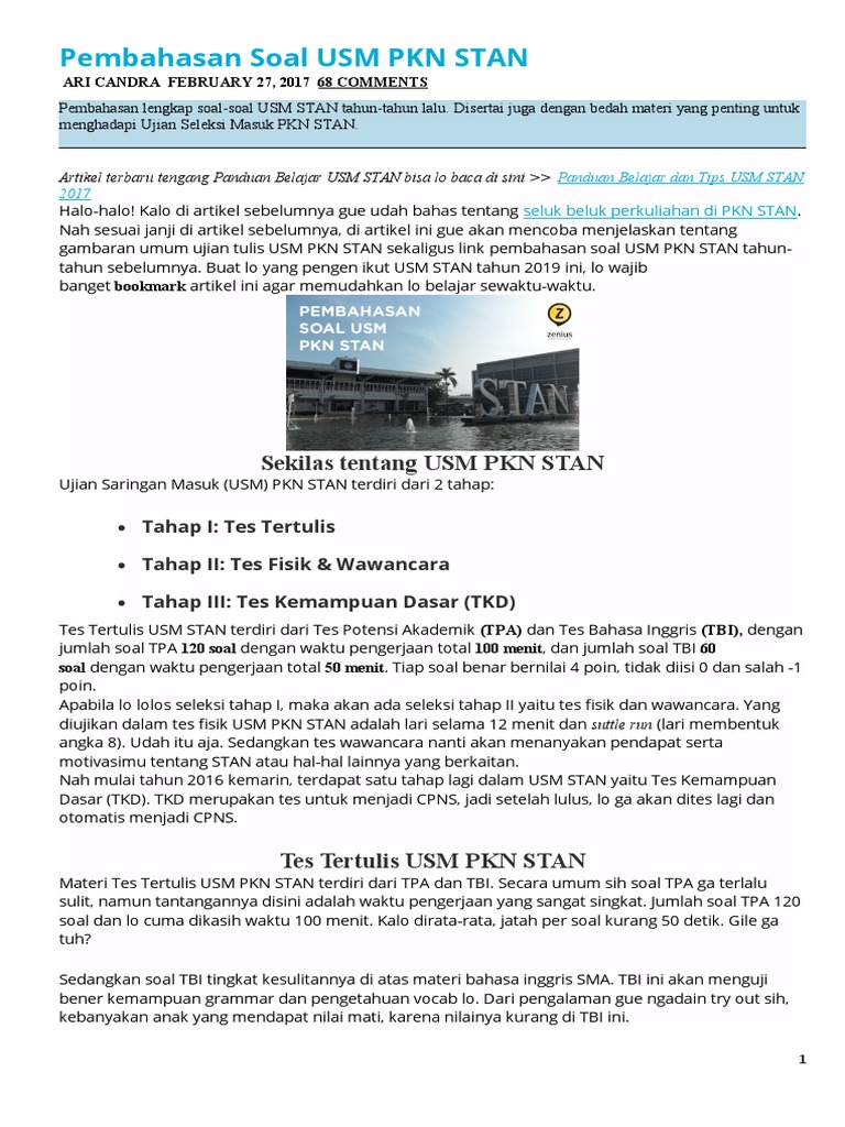 Materi pengayaan tes potensi akademik usm stan dari bimbel bebas download. Tiap soal yang dijawab benar akan bernilai 4 poin, tidak diisi 0 dan. Soal dan pembahasan usm stan 1999 download. Latihan soal tes masuk stsn seleksi akademik materi ujian bahasa inggris. Sebagaimana diinformasikan dalam banyak sekali media, materi dan bahan soal tes ujian masuk pkn stan 2018/2019 adalah soal tes potensi akadamik (tpa), tes bahasa inggris, seleksi kompetensi dasar (skd) atau soal tkd (tes kemampuan dasar) yang terdiri dari terdiri dari tes wawasan kebangsaan (twk), tes intelegensi umum (tiu), tes karakteristik pribadi (tkp).